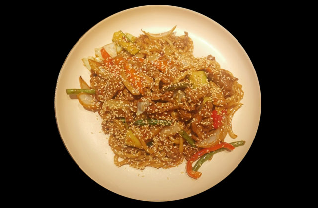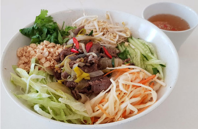 V3 Bun Bo, risnudlar, nöttkött, kyckling, räkor, böngroddar, koriander, mynta, rostad lök, jordnötter. 129:-