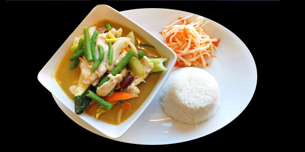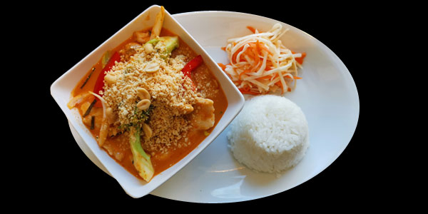 Thailändsk mat karaktäriseras av den fina blandningen av sött, salt och syrligt samt balansen mellan det starka och det milda. Vegetarisk (tofu) eller Kyckling: 109:- Biff, Räkor: 119:- eller Anka: 149:-. Thai vårrullar 69:- (innehåller gluten). Alla thaimat rätter är laktosfria och glutenfria.